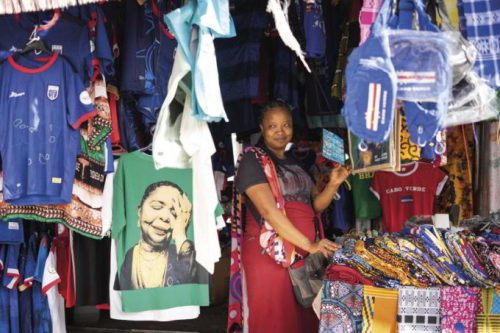 A seller of Cape Verdean promotional items at a stall in the Assomada market. Photo: Javier Sánchez Salcedo